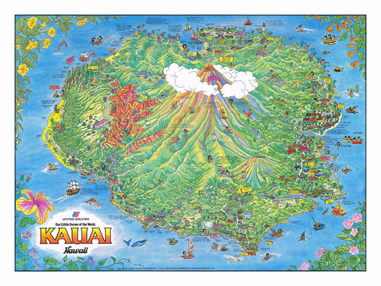 Die "Kauai, Hawaii"-Karte, die von dem talentierten James Olson im Jahr 1980 entworfen wurde, ist eine fesselnde bildliche Darstellung, die das Wesen dieses hawaiianischen Paradieses einfängt. Bekannt für sein künstlerisches Flair, hat Olson diese Karte mit fantasievollen Illustrationen gefüllt, die die lebhaften Touristenziele und kulturellen Wahrzeichen der Insel hervorheben. Als Werbemittel für United Airlines in Auftrag gegeben, dient diese Karte nicht nur als dekoratives Element, sondern auch als historisches Artefakt aus der Zeit des aufkommenden Flugverkehrs und Tourismus.