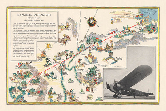 Bildkarte der Luftroute von Los Angeles–Salt Lake City, 1929: Western Air Express, Tri-Motor Fokker, Las Vegas, Großer Salzsee, Zion-Nationalpark