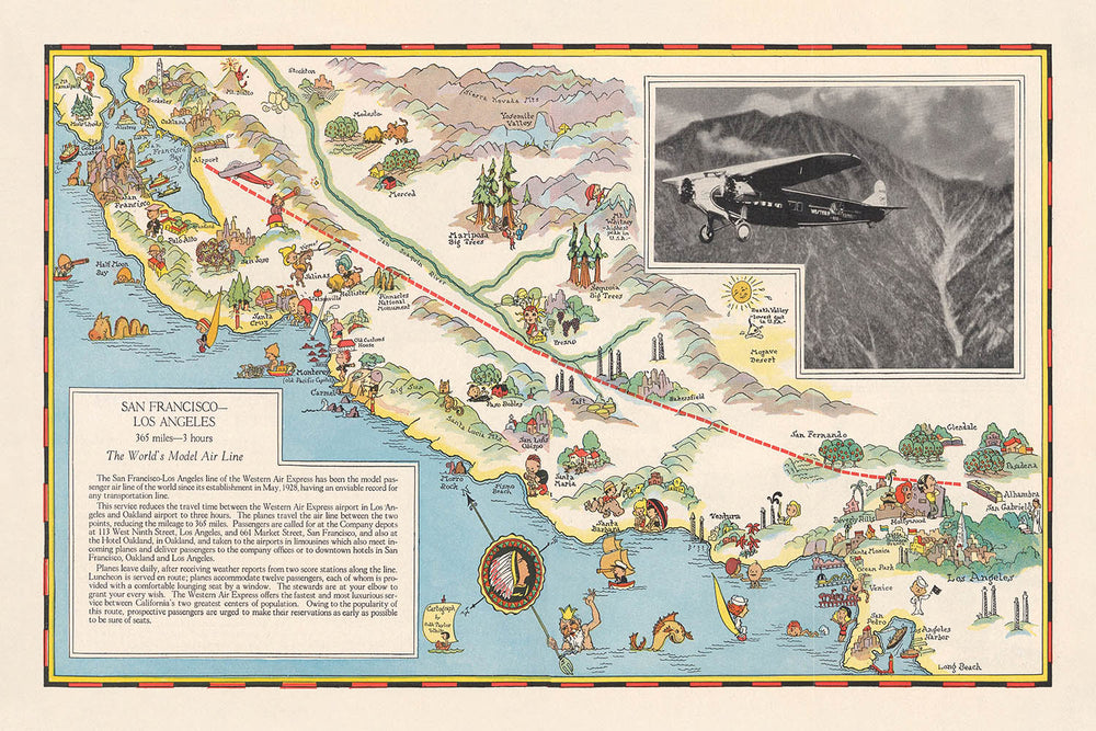 - Die Luftroute zwischen San Francisco und Los Angeles, prominent illustriert