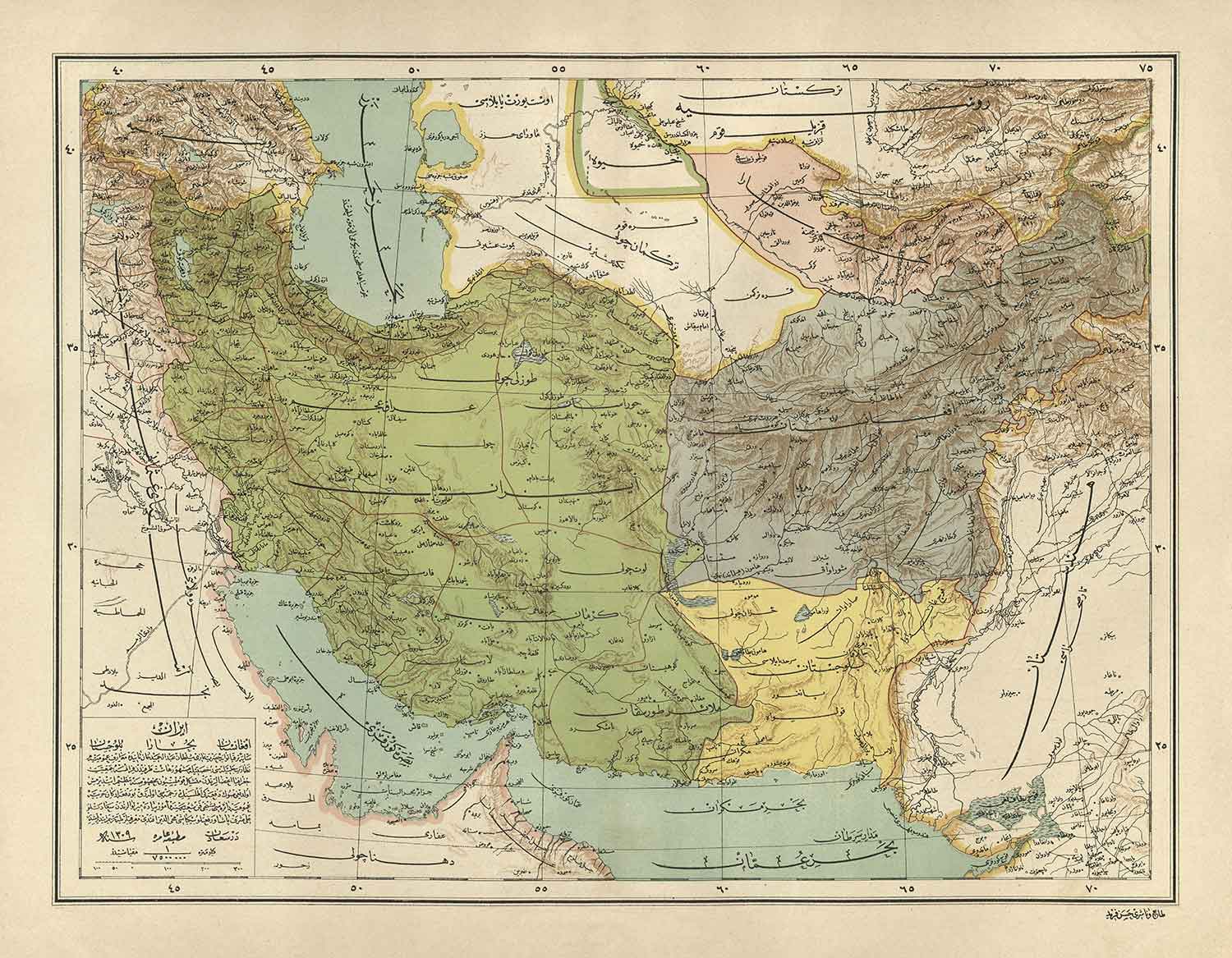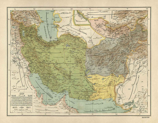 Alte arabische Karte von Iran, Pakistan, Afghanistan und Usbekistan im Jahr 1891: Arabien, Kuwait, Persischer Golf, Kaspisches Meer, UdSSR