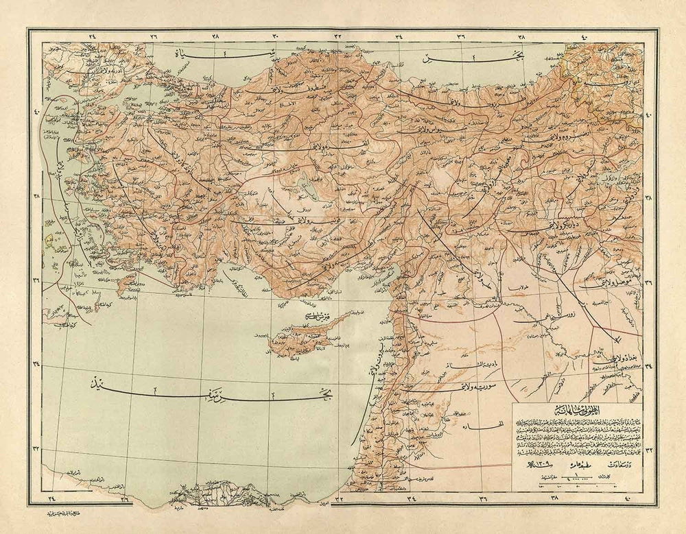 Alte arabische Karte der Türkei von Hafız Ali Eşref, 1893: Zypern, Syrien, Palästina, Osmanisches Reich, Schwarzes Meer, Anatolien