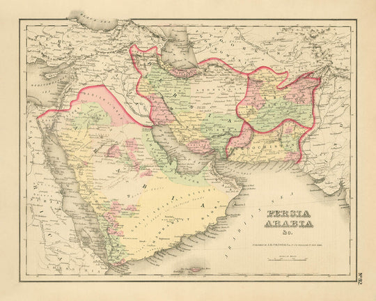 Betreten Sie die komplexe Welt der Kartographie des 19. Jahrhunderts mit "Persien Arabien &c.", einem Meisterwerk, das 1857 vom renommierten Joseph Hutchins Colton veröffentlicht wurde. Diese exquisite Karte, die in New York zur Blütezeit von Coltons Karriere hergestellt wurde, fängt die weiten und geheimnisvollen Landschaften des Nahen Ostens ein, die vom Herzen Persiens bis zu den weitläufigen Wüsten Arabien und den geschichtsträchtigen Küsten des Persischen Golfs reichen. Coltons charakteristischer dekorativer Rand und die zarten Pastellfarben rahmen eine Region im Wandel und bieten einen seltenen Einblick in eine Zeit vor den seismischen geopolitischen Veränderungen, die diese Länder in den folgenden Jahrzehnten neu definieren würden.