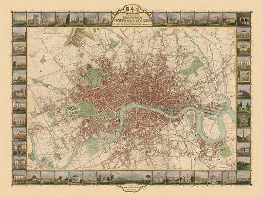 Tallis' Karte ist besonders bemerkenswert für ihre künstlerischen Vignetten und Illustrationen prominenter Gebäude und Wahrzeichen. Der Rand ist mit Darstellungen wichtiger Strukturen geschmückt, die eine Tour durch Londons architektonische Schätze bieten. Dieses dekorative Element verbessert nicht nur die ästhetische Anziehungskraft der Karte, sondern dient auch als historisches Dokument der wichtigsten Stätten der Stadt. Die Präsenz von Wahrzeichen wie dem Hyde Park und dem Regent's Park unterstreicht die Bedeutung von Grünflächen in der städtischen Landschaft und sorgt für einen Ausgleich zur geschäftigen Aktivität der Stadt.