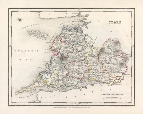 Zu den bemerkenswerten Merkmalen auf dieser Karte gehört Ennis, die Kreisstadt von Clare, mit ihrer reichen mittelalterlichen Geschichte und ihren bezaubernden Straßen. Auch Kilrush, ein wichtiger Handelshafen an der Shannon-Mündung, wird vorgestellt und seine maritime Bedeutung hervorgehoben. Die Karte umfasst außerdem die atemberaubende Halbinsel Loop Head, die für ihre schroffen Klippen und malerischen Leuchttürme bekannt ist. Schließlich verleiht die Burren-Landschaft mit ihrem einzigartigen Karstgelände und antiken archäologischen Stätten dieser historischen Darstellung ein faszinierendes Element.