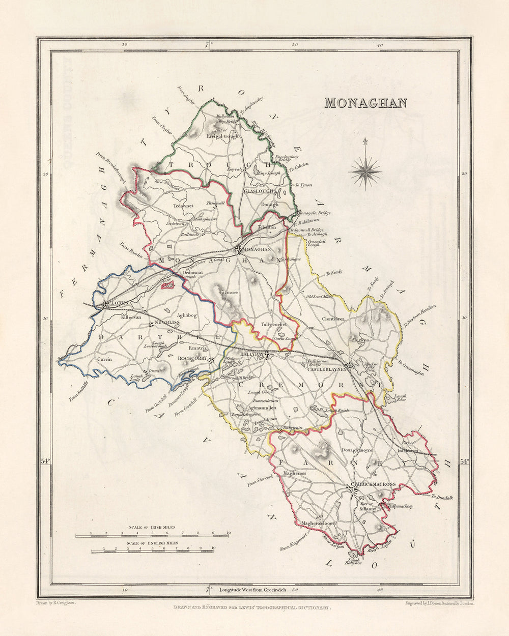 Alte Karte des County Monaghan von Samuel Lewis, 1844: Castleblayney, Clones, Ballybay, Carrickmacross, Glaslough