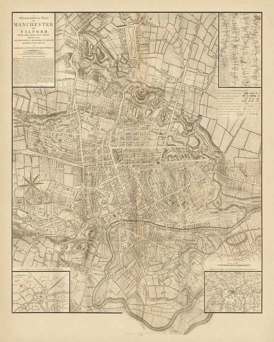 „A Topographical Plan of Manchester and Salford with the Adjacent Parts“ aus dem Jahr 1793 ist ein faszinierendes Stück kartografischer Geschichte und bietet einen seltenen Einblick in die aufstrebende Stadtlandschaft Manchesters im späten 18. Jahrhundert. Diese von Charles Laurent erstellte Karte ist nicht nur ein Beweis für die akribische Kunst früher Vermessungsarbeiten, sondern auch ein Spiegelbild der rasanten Entwicklung der Stadt. Laurent nutzte die Gelegenheit, vor dem berühmten William Greene zu veröffentlichen, und nutzte Greenes Vermessungsdaten gekonnt, um diese detaillierte Darstellung Manchesters zu erstellen, die die geplanten Entwicklungen zeigt, die die Zukunft der Stadt prägen würden.