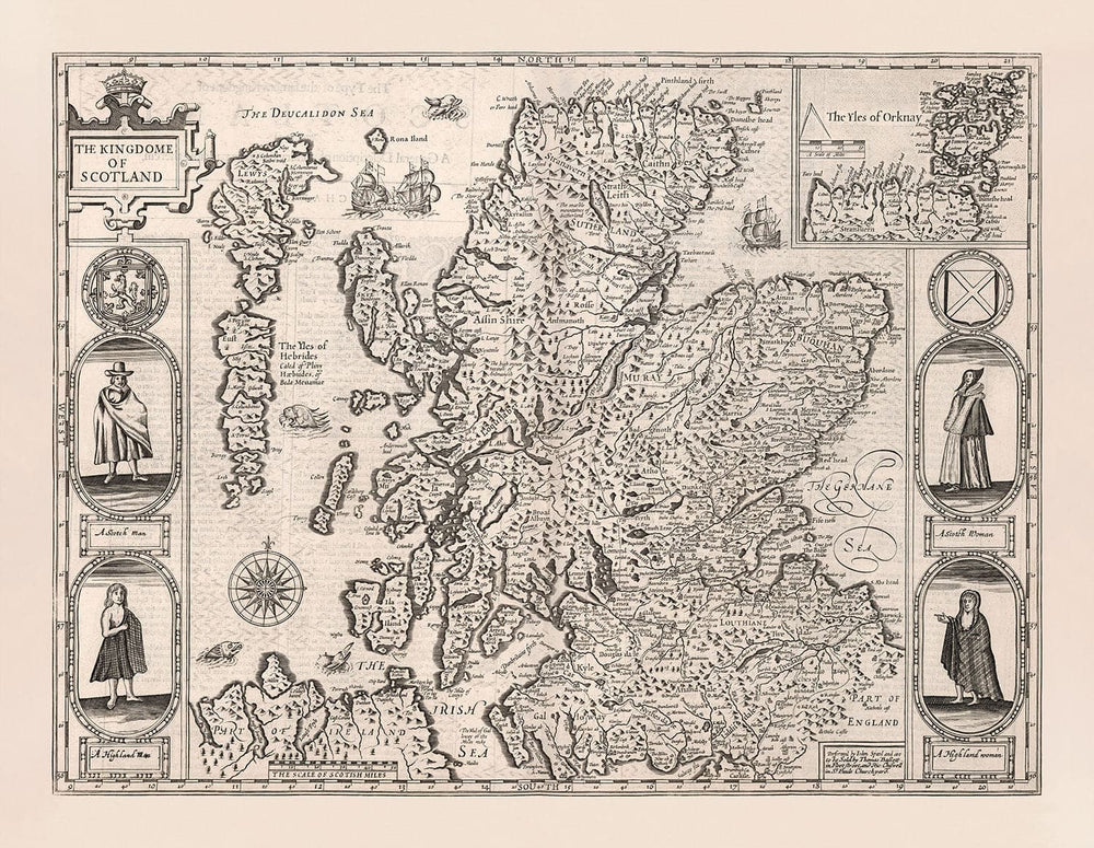 Viele der Städte, Dörfer und Gemeinden in Schottland sind bereits auf dieser Karte sichtbar. Oben rechts gibt es eine Einlage mit einer Gravur der Orkney-Inseln. Eingefügt sind Gravuren verschiedener Royals, wie König James von Großbritannien, Frankreich und Irland, Königin Anne und Prinz Henry. Eine spätere Version der Karte würde die Royals durch Bürger ersetzen. Die Shetlandinseln, Hebriden, Skye, Loch Ness, Loch Lomond, Mull of Kintyre... sie sind alle hier.