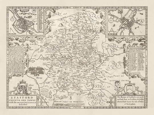Viele der Städte, Dörfer und Gemeinden in Staffordshire sind bereits auf dieser Karte sichtbar. Im 17. Jahrhundert umfasste Staffordshire einen großen Teil dessen, was heute die West Midlands ist. Wolverhampton, Birmingham und Walsall sind alle auf dieser Karte.