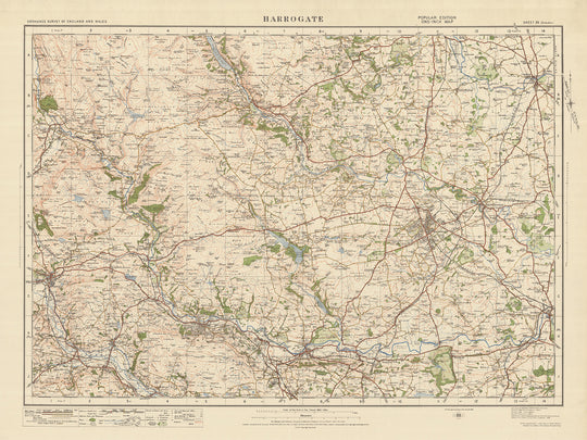 Diese bemerkenswerte Karte mit dem Titel "Blatt 26 - Harrogate" ist Teil der berühmten 1-Zoll-"Popular"-Ausgabe der Ordnance Survey-Karten für England und Wales, die 1925 veröffentlicht wurde. Die Karte zeigt die historische Stadt Harrogate und ihre Umgebung und bietet einen faszinierenden Einblick in die Vergangenheit. Neben Harrogate sind auf dieser Karte die Städte Otley, Ilkley, Skipton, Knaresborough und das atemberaubende Nidderdale Area of Outstanding Natural Beauty (AONB) zu sehen.