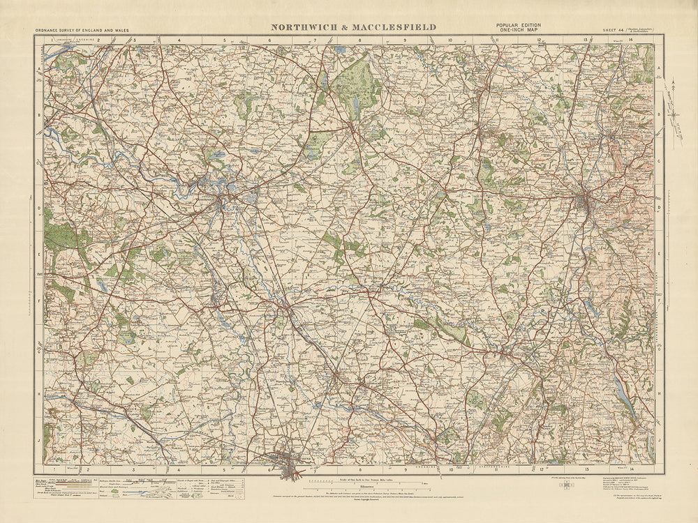 Diese alte Karte mit dem Titel „Blatt 44 – Northwich & Macclesfield“ ist Teil der 1-Zoll-Ausgabe „Popular“ des Ordnance Survey für England und Wales, die 1925 veröffentlicht wurde. Die Karte zeigt die historische Grafschaft Cheshire mit besonderem Schwerpunkt auf Städte Northwich und Macclesfield. Es umfasst jedoch auch andere bedeutende Städte und Gebiete wie Knutsford, Crewe, Macclesfield, Wilmslow und Winsford.