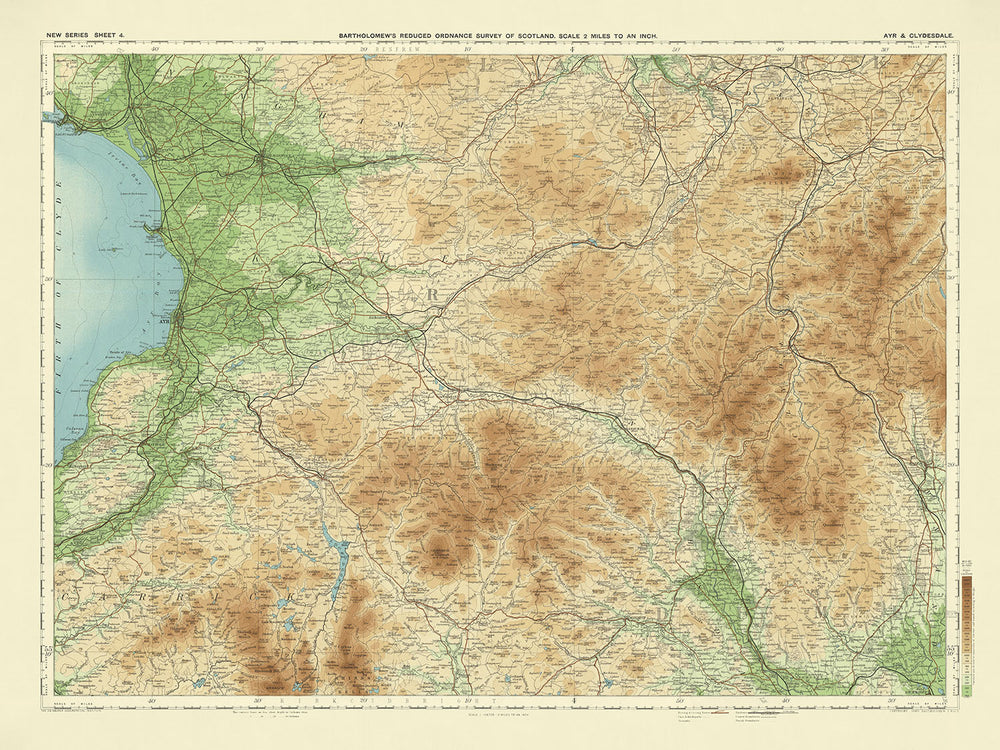 Das Design und der Stil dieser Karte sind ein Beweis für Bartholomews Genie. Die Verwendung von Farben zur Kennzeichnung unterschiedlicher Höhenlagen ist sowohl praktisch als auch visuell ansprechend, was es einfach macht, das Gelände auf einen Blick zu verstehen. Die sorgfältige Aufmerksamkeit zum Detail bei der Darstellung von Straßen, Eisenbahnen, Flüssen und topografischen Merkmalen spricht für die hohen Standards an Genauigkeit und Kunstfertigkeit, die Bartholomew sich selbst setzte. Diese Karte ist nicht nur eine Darstellung einer Region; sie ist ein Fenster in die Vergangenheit und bietet eine detaillierte und schöne Momentaufnahme von Ayr und Clydesdale, wie sie vor über einem Jahrhundert waren.
