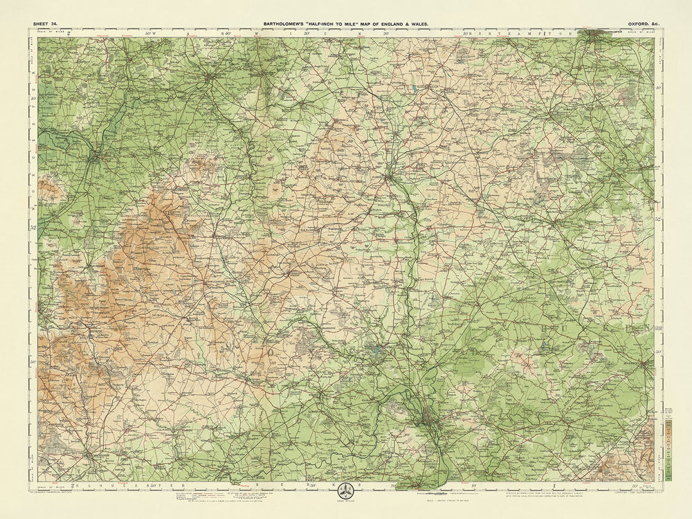 Historisch gesehen ist diese Karte bedeutend, da sie das wachsende Interesse am Freizeitreisen und Radfahren zu Beginn des 20. Jahrhunderts widerspiegelt. Bartholomews Werk bot nicht nur praktische Navigationshilfen, sondern inspirierte auch zu Erkundungen und Abenteuern. Die detaillierte und genaue Darstellung der Landschaft machte sie zu einem unverzichtbaren Begleiter für Reisende der damaligen Zeit. Heute dient sie als wertvolles historisches Dokument und bietet Einblicke in die Geografie, Infrastruktur und kulturellen Wahrzeichen der Region Oxford vor über einem Jahrhundert.