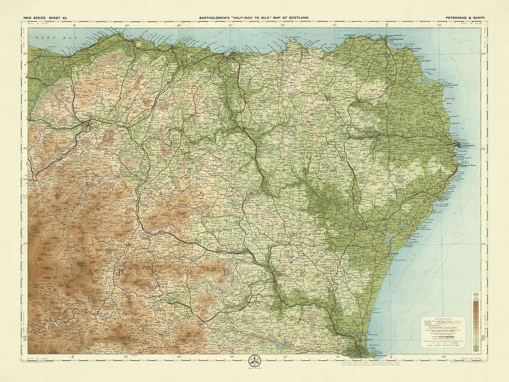 Bartholomews „Blatt 22 – Peterhead & Banff“ ist mehr als nur eine Karte; es ist ein Stück Geschichte, ein Kunstwerk und ein Beweis für das Können und die Vision des Kartografen. Es fängt die Essenz einer vergangenen Ära ein und bietet eine detaillierte und lebendige Darstellung der natürlichen Schönheit, der historischen Wahrzeichen und der sich entwickelnden Infrastruktur der Region. Ob Sie ein Geschichtsliebhaber, ein Liebhaber feiner Kartografie oder einfach jemand sind, der die Schönheit der schottischen Landschaft zu schätzen weiß, diese Karte ist ein zeitloser Schatz, der Ihr Verständnis und Ihre Wertschätzung der Vergangenheit bereichern wird.