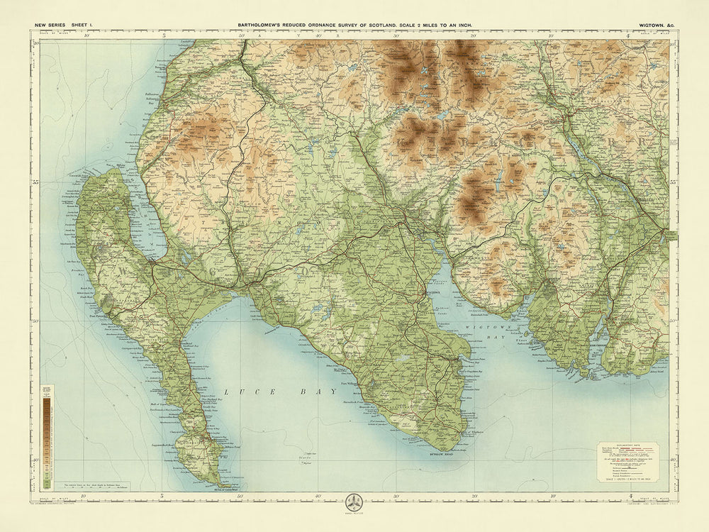 Die Karte deckt ein Gebiet von 36 Meilen von Norden nach Süden und 52 Meilen von Westen nach Osten ab und bietet einen umfassenden Blick auf die Region Wigtown in Schottland. Sie hebt bedeutende geografische Merkmale wie die Luce Bay und die Wigtown Bay sowie die markante Halbinsel Rhins of Galloway hervor. Der Mull of Galloway, Schottlands südlichster Punkt, wird ebenfalls prominent dargestellt, zusammen mit den bemerkenswerten Hügeln Cairnsmore of Fleet und Cairnsmore of Carsphairn. Diese natürlichen Landmarken sind detailliert ausgearbeitet und zeigen Bartholomews Engagement für Genauigkeit und sein tiefes Verständnis der Topografie der Region.