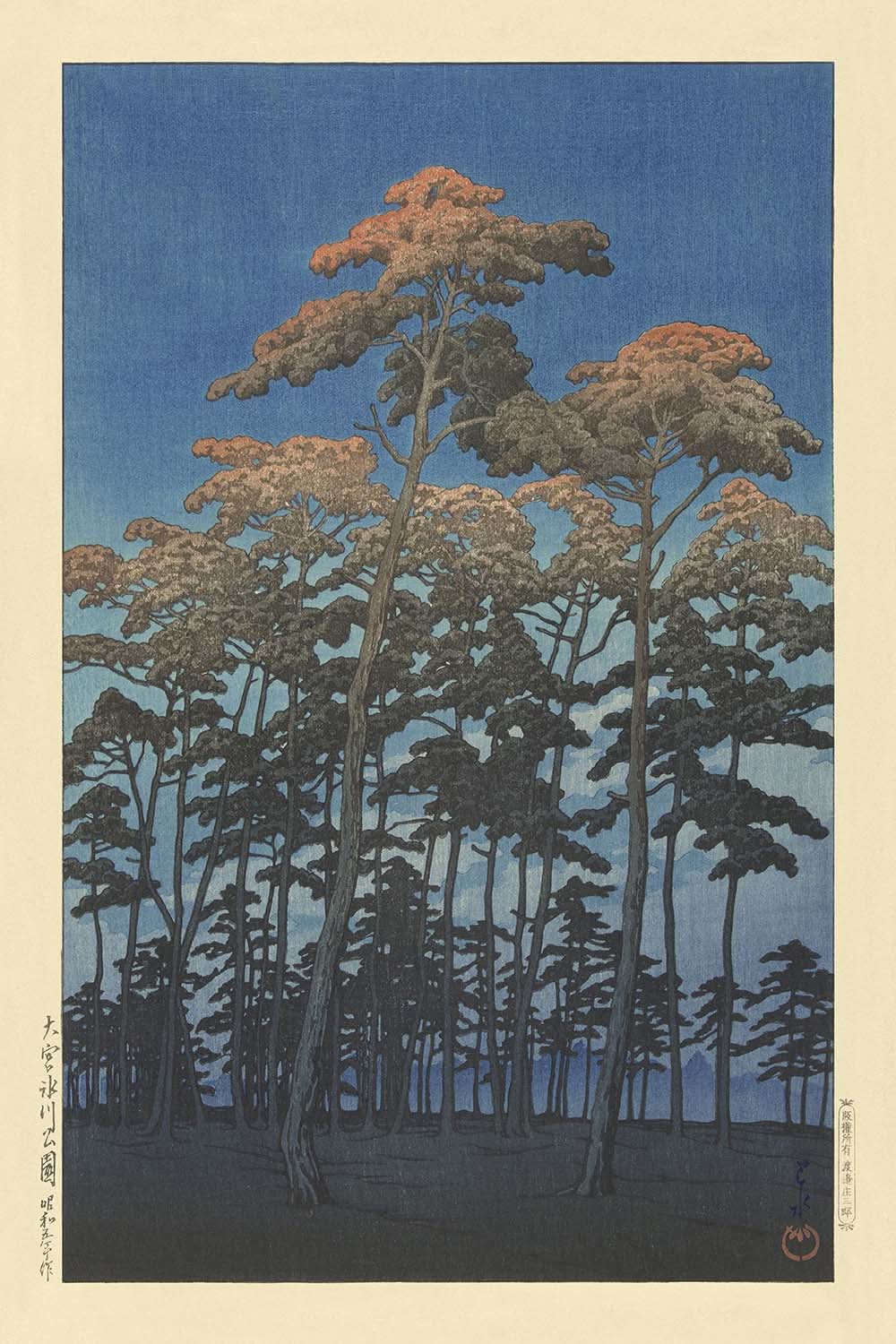 Hasui Kawase ist bekannt für seine atemberaubenden Landschaften, die Japans malerische Aussichten auf wunderschöne Weise zelebrieren. Er hat im Laufe seines Lebens über 600 Holzschnitte angefertigt. Seine Werke zeichnen sich durch ihre atmosphärische Qualität aus und vermitteln ein Gefühl von Einsamkeit und Besinnung. Der Hikawa-Park in Omiya bildet da keine Ausnahme und stellt das harmonische Gleichgewicht zwischen menschlichem Leben und Natur dar.