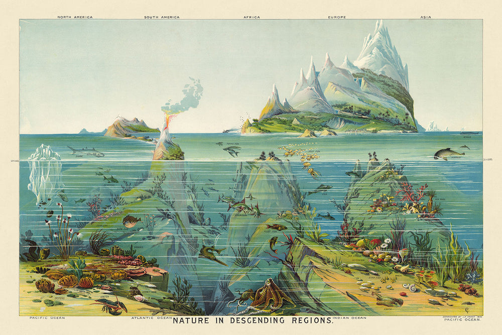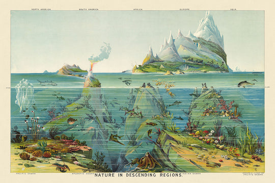 Levi Walter Yaggy, ein innovativer Pädagoge des 19. Jahrhunderts, ist bekannt für seine majestätischen geografischen und lehrenden Karten. Sein visionärer Einsatz der Chromolithografie ermöglichte es ihm, atemberaubend farbenfrohe Bildungsvisualisierungen zu produzieren, die für den Einsatz im Klassenzimmer gedacht waren. "Natur in absteigenden Regionen" verkörpert seine Leidenschaft für Geografie und Bildung und zeigt lebendige Farben und dynamische Kompositionen, die die natürliche Welt für junge Lernende zum Leben erwecken.