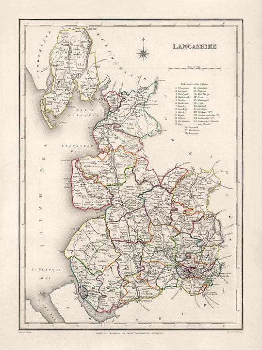 Betreten Sie eine Welt, die reiche Geschichte und kartografische Kunst mit dieser exquisiten Karte von Lancashire aus dem Jahr 1844, sorgfältig erstellt von Samuel Lewis, verbindet. Über die beeindruckenden Details und die hervorragende Genauigkeit hinaus bietet diese Karte einen einzigartigen Blick auf eine vergangene Ära und zeigt Siedlungen in ihrer frühen Entwicklung, von denen einige Namen tragen, die sich seitdem geändert haben. Das Lancashire der Vergangenheit wird in dieser Karte lebendig, ein Erinnerungsstück an die bemerkenswerte Evolution unserer Städte, Dörfer und Gemeinden sowie an die sich ständig verändernde menschliche Landschaft.
