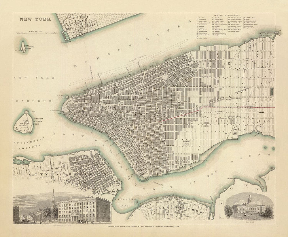Alte Karte von New York, USA im Jahr 1840: Manhattan, Brooklyn, Williamsburg, Hudson River