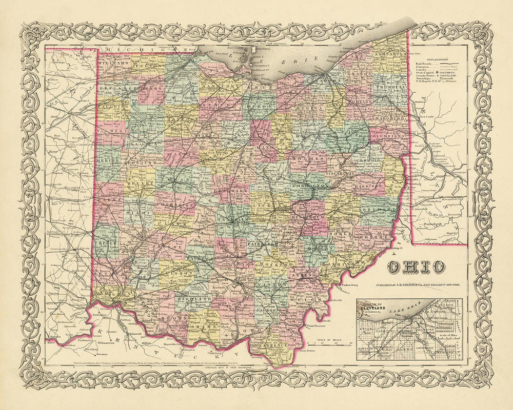 Tauchen Sie ein in die Vergangenheit mit dieser äußerst detaillierten alten Karte von Ohio, die 1855 vom angesehenen Kartenzeichner JH Colton angefertigt wurde. Colton, der weithin als der beste amerikanische Kartenzeichner seiner Zeit gilt, hat in dieser sorgfältig gestalteten Karte die Essenz der frühen Geschichte Ohios eingefangen. Die Karte zeigt den Staat Mitte des 19. Jahrhunderts, als die Vereinigten Staaten noch in den Kinderschuhen steckten und viele der Siedlungen, die wir heute kennen, noch gegründet werden mussten.