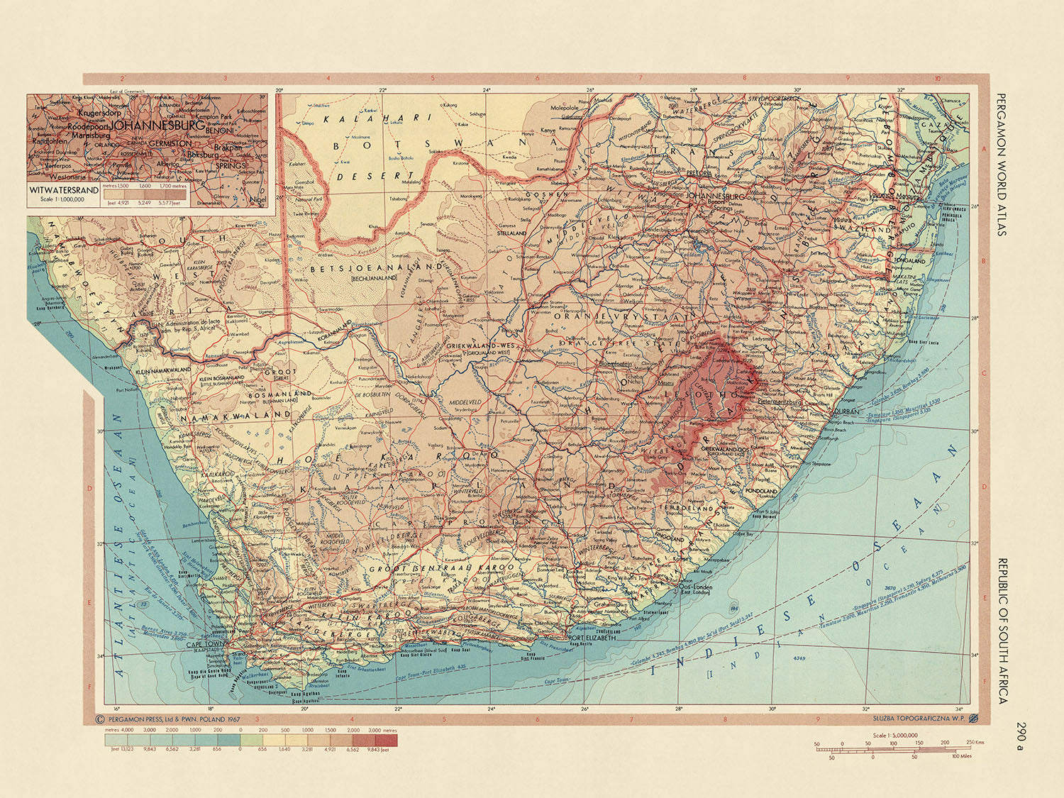 Diese Karte der Republik Südafrika aus dem Jahr 1967, herausgegeben vom Topographischen Dienst der polnischen Armee, ist eine detaillierte politische und physische Karte, die einen umfassenden Überblick über die Geographie und die politische Landschaft des Landes bietet. Die Karte deckt ganz Südafrika ab, wobei der Schwerpunkt auf der Topographie, den Großstädten und den bedeutenden Sehenswürdigkeiten liegt.