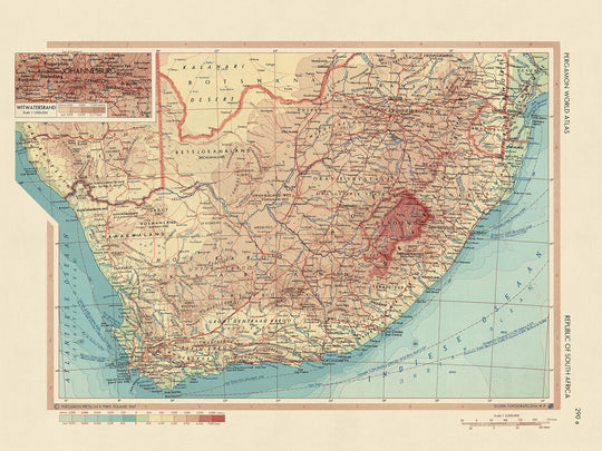 Die Bedeutung der Karte liegt in ihrer Fähigkeit, einen Moment in der Geschichte Südafrikas einzufangen. Es wurde 1967 veröffentlicht und spiegelt die politische und geografische Landschaft des Landes in einer Zeit bedeutender Veränderungen wider. Südafrika war erst 1961 eine Republik geworden und die Karte bietet einen Einblick in die neue politische Identität des Landes. Darüber hinaus stellt die Karte die vielfältige Geographie des Landes dar und ist somit eine wertvolle Ressource für das Verständnis der Naturwunder Südafrikas.