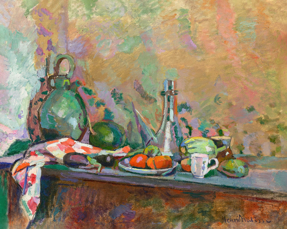 Henri Matisse, oft als einer der einflussreichsten Künstler des zwanzigsten Jahrhunderts gefeiert, nutzte gewagte Einfachheit, um Emotionen hervorzurufen und das Wesen des Motivs einzufangen. "Nature morte au purro, I" ist ein feines Beispiel für dieses Meisterwerk. Das Kunstwerk ist bemerkenswert für seine innovative Verwendung von kräftigen Farben – überwiegend reiches Rot, strahlendes Gelb und frisches Grün. Jeder Farbton interagiert kühn, funktioniert jedoch harmonisch, wodurch ein fesselnder visueller Dialog entsteht, der emblematisch für Matisse's unverwechselbaren Stil ist.