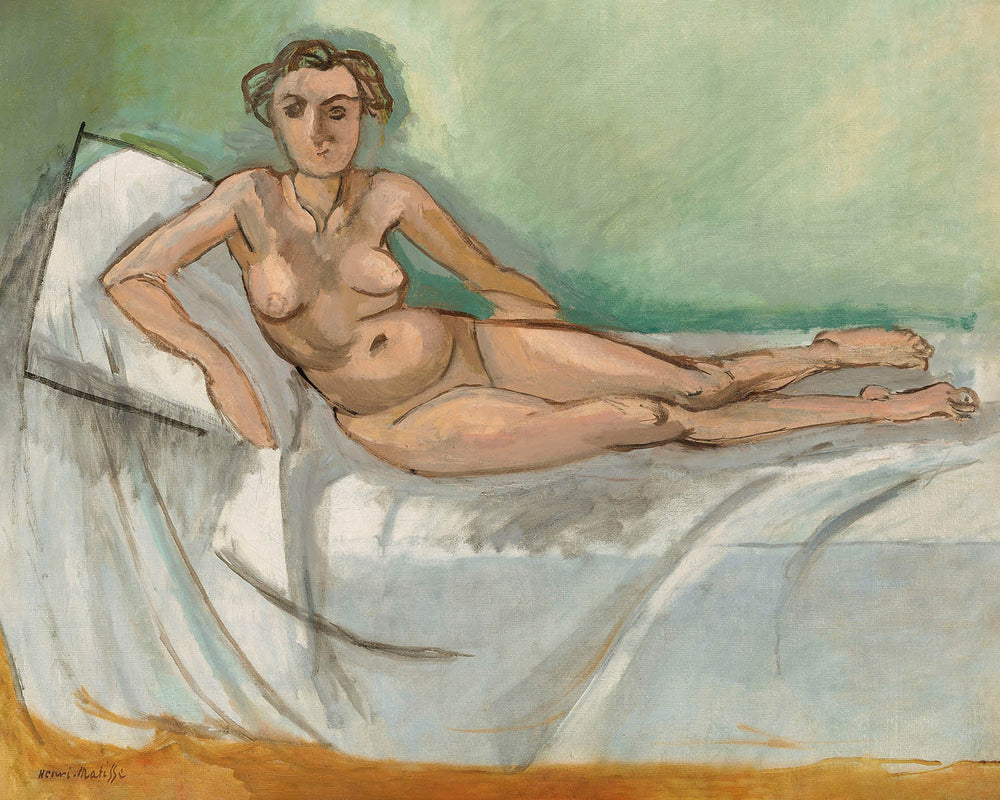 Henri Matisse war bekannt für seinen mutigen und eindringlichen Einsatz von Farbe und Form. "Nu demi couché" ist ein perfektes Beispiel für seinen Stil, in dem er die Ruhe und Eleganz der menschlichen Form mit minimalistischer Anmut einfängt. Dieses Gemälde ist bemerkenswert für seinen subtilen Einsatz einer überwiegend weißen Palette, akzentuiert durch zarte Einsprengsel von Grün und Beige, die ein Gefühl von Ruhe und Harmonie schaffen. Die Einfachheit der Farben und die zarte Geste der liegenden Figur heben Matisse's geschickte Handhabung von Balance und Komposition hervor.