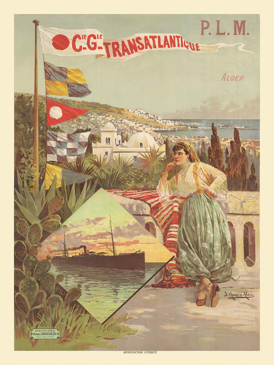 This Alger poster stands at the crossroads of history and modernity. In 1898, the P.L.M. railway connected inland Europe to Mediterranean ports, while the Compagnie Générale Transatlantique extended the journey across the sea—turning Algiers into a gateway city for leisure and commerce. The work celebrates that seamless journey: rails to the coast, ship to the Maghreb, and the cultural encounter that awaited travelers in North Africa during a time when international tourism was opening to a broader middle class.
