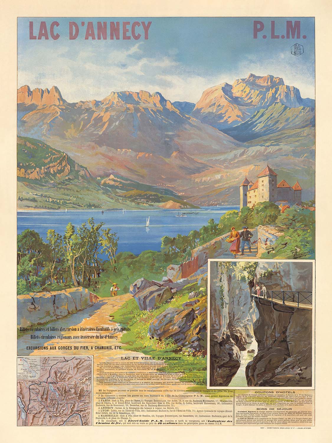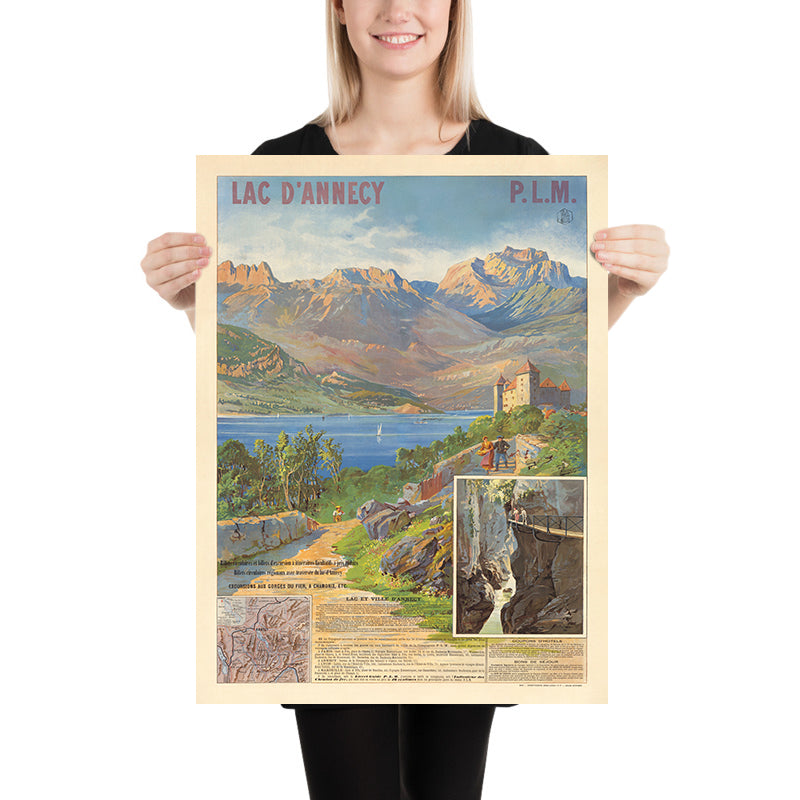 The subject here—Lac d’Annecy and its historic lakeside town—was a dream destination promoted by the Paris–Lyon–Méditerranée (P.L.M.) railway, whose network opened the Alps to leisure travel in the late 19th century. This poster places viewers at a vantage where culture and nature meet: the medieval castle and tidy roofs of Annecy stand as guardians of the shoreline, while figures stroll, boat, and gaze across the expanse, emblematic of a new era of recreation and alpine air cures. The scene conveys not only a promise of arrival but the soothing rhythm of waterside life.