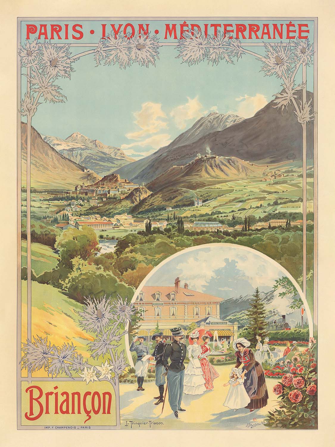Created in 1901 at the height of the Belle Époque, Paris-Lyon-Méditerranée. Briançon by Louis Trinquier-Trianon invites the viewer to the sunlit embrace of the French Alps. This Art Nouveau travel poster celebrates Briançon—France’s lofty, fortified mountain town—through flowing lines, floral ornament, and a poised tableau of elegant holidaymakers. Designed for the famed PLM railway, the composition fuses natural grandeur with the optimism of modern travel, when new rail links made alpine air, dramatic valleys, and historic ramparts accessible to a wider public.