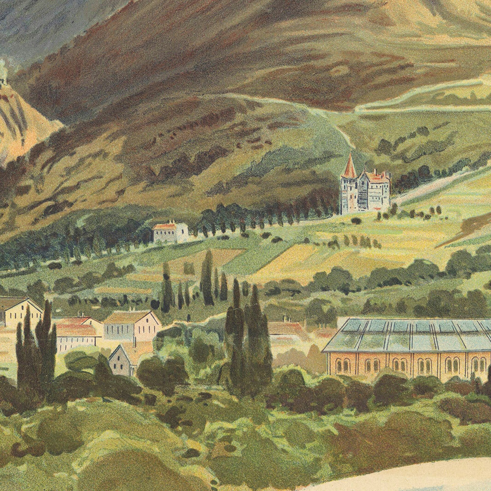 Trinquier-Trianon’s color language is a joy to live with. A dominant green palette suggests cool alpine meadows and forests; blues convey crystalline skies and mountain distance; and warm yellow accents bathe the scene in high-altitude sunlight. Rounded, organic motifs at the top form a floral canopy—pure Art Nouveau—while the crisp geometry of architecture and signage introduces a satisfying counterbalance. The result is romantic yet well-ordered, equally at home in classic interiors or pared-back contemporary rooms. For lovers of France, alpine landscapes, and railway heritage, it’s a timeless statement piece.