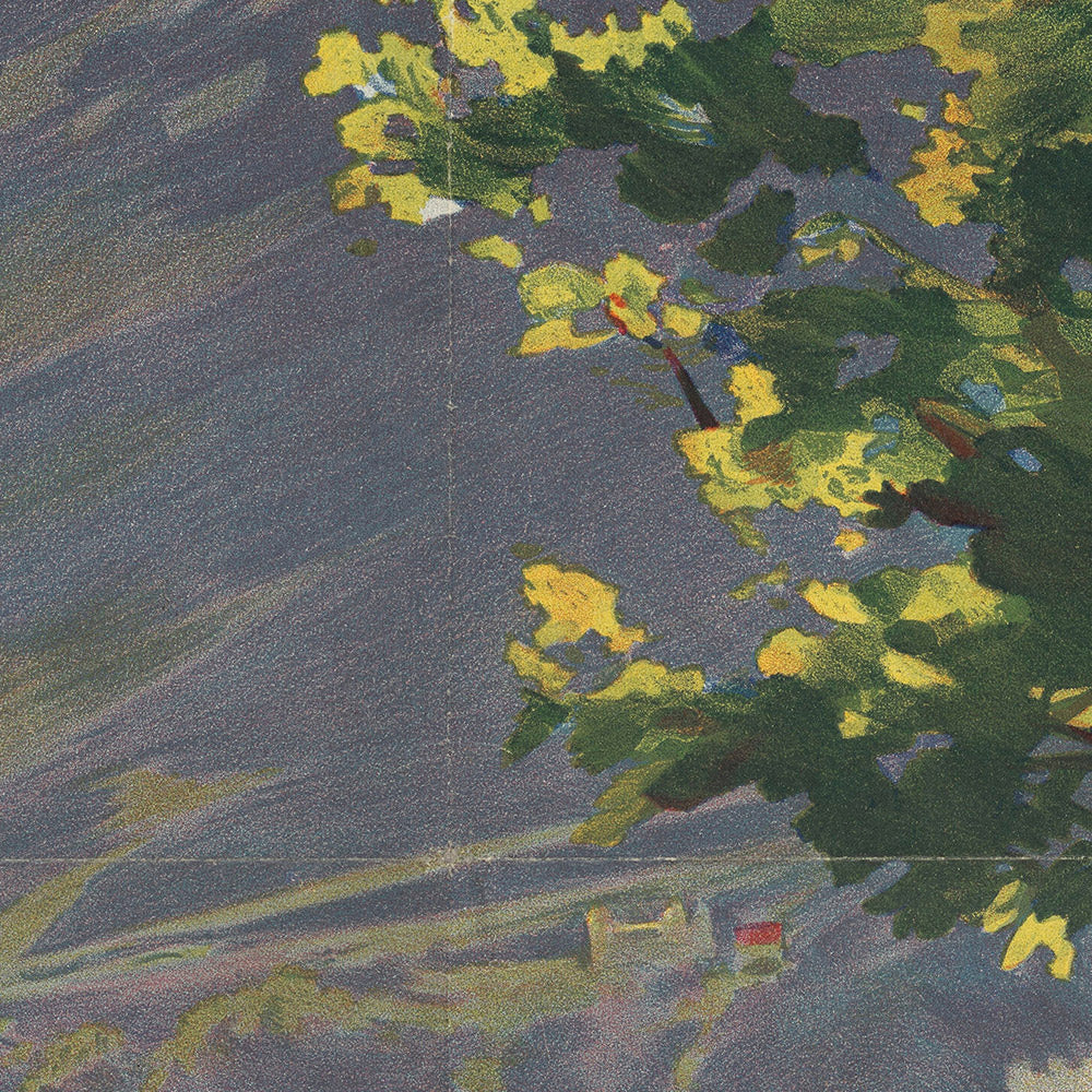 This artwork is notable for how it crystallizes the romance of travel to Aix‑les‑Bains: the promise of restorative waters, clear mountain air, and leisurely days by the lake. The composition places the viewer on a shaded overlook, suggesting the cool refuge of the forest before stepping into the sunlit openness of the bay. It speaks to the interwar and Belle Époque taste for elegant, restorative destinations—places where wellness and scenic grandeur met.