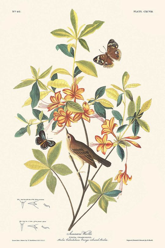 Der braunköpfige Würmerfresser-Waldsänger hat einen besonderen Platz in Audubons Sammlung. Entdeckt von Audubons Freund John Bachman in der Nähe von Charleston, South Carolina, wird die schwer fassbare und faszinierende Natur dieses Vogels in der Illustration wunderschön eingefangen. Die warmen Brauntöne und zarten Details, ergänzt durch eine begleitende Darstellung von Azaleenblüten und einem Schmetterling von Miss Martin, veranschaulichen die natürliche Eleganz und den ruhigen Charme von Audubons Werk.