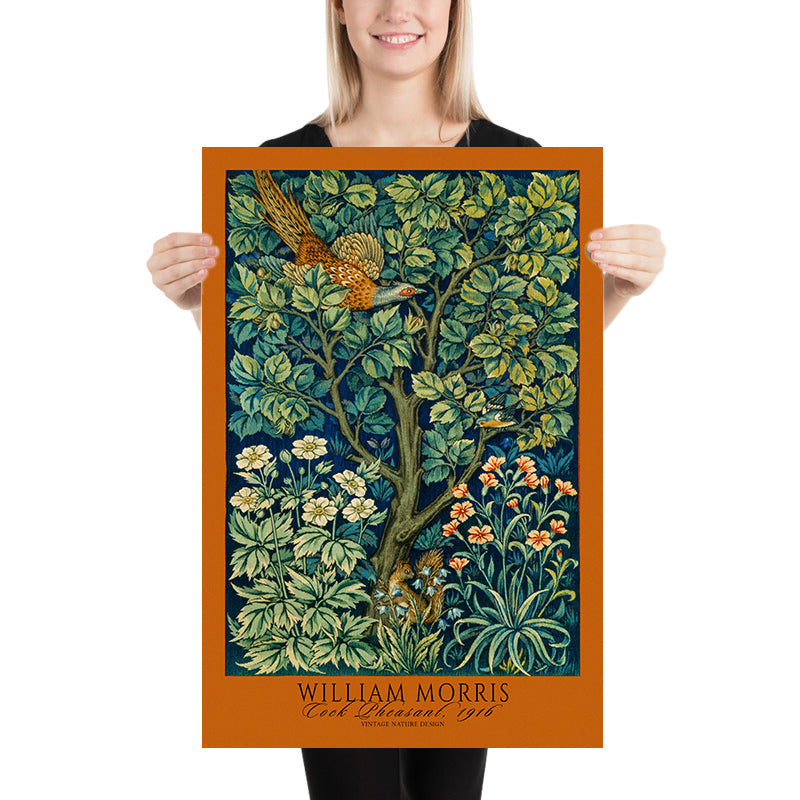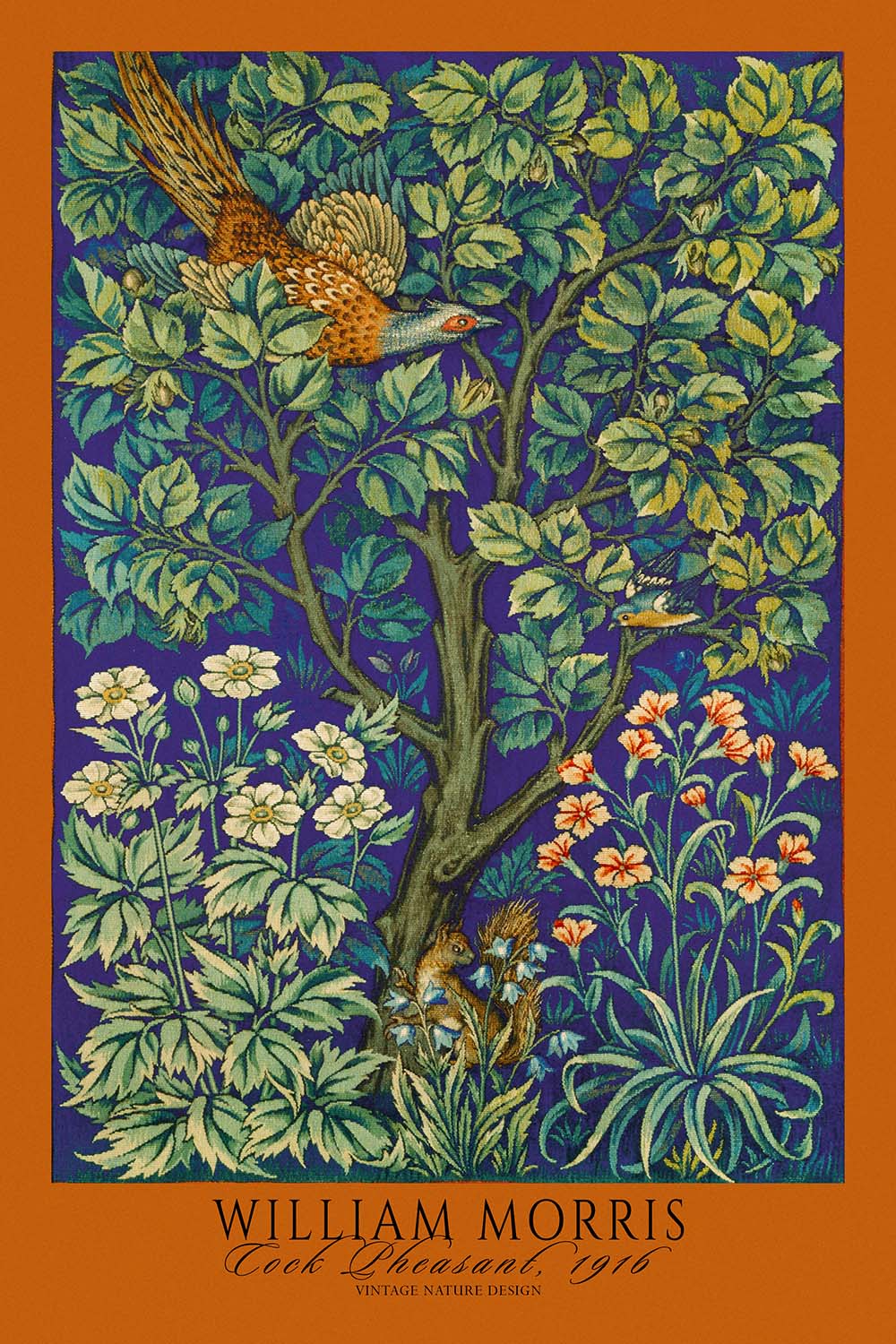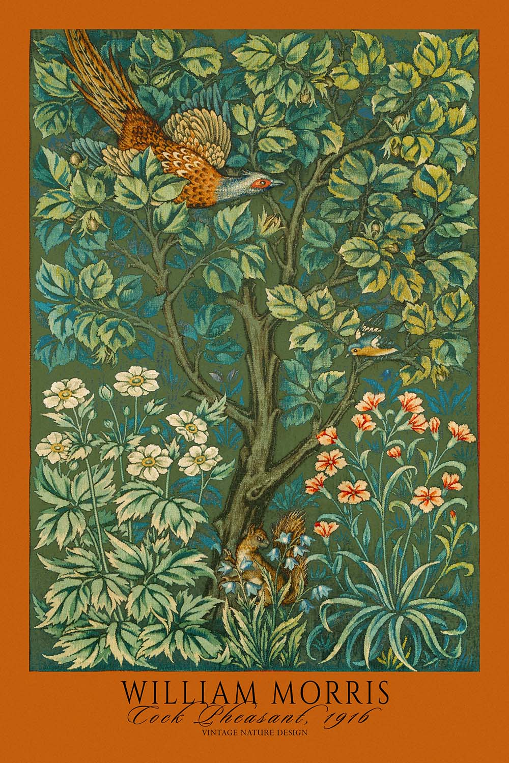 Cock Pheasant by William Morris (1916) is a richly detailed Arts & Crafts pattern that celebrates the harmony of flora and fauna. Most likely conceived as a wallpaper design—and equally at home as a carpet, curtain, or other textile—the composition places a proud pheasant amid twining stems and stylized blossoms, with wildlife elements that enliven the repeat. Rooted in the ideals of handcraft and a reverence for nature, the design channels Morris’s vision of beauty made for everyday interiors.