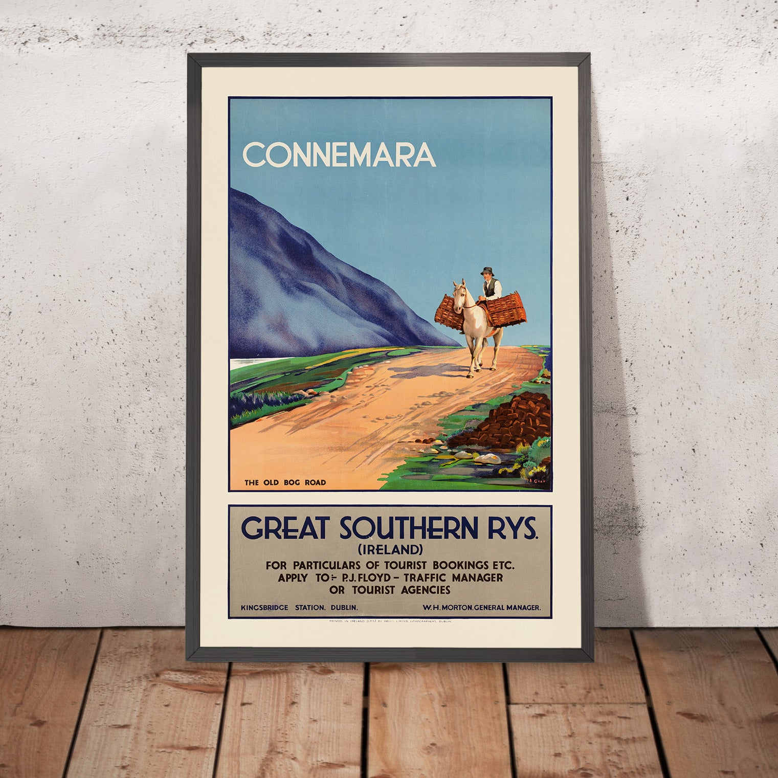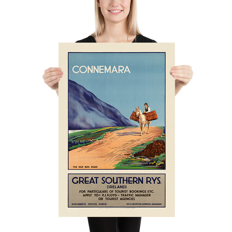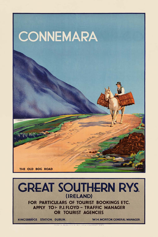 Connemara. The Old Bog Road is a classic Irish travel poster, created for the Great Southern Railways to entice visitors to the wild west of Ireland. The individual artist is unknown—typical of railway publicity studios of the era—but the publisher is clearly identified on the poster as Great Southern Rys. (Ireland), with booking details from Kingsbridge Station, Dublin. In a single, lyrical scene, a man leads a white pack pony along the terracotta sweep of a bog road, with blue-violet mountains rising to the left and an immense Atlantic-blue sky overhead. The caption “THE OLD BOG ROAD” appears in the image panel, placing the view squarely in Connemara’s peatland heart.