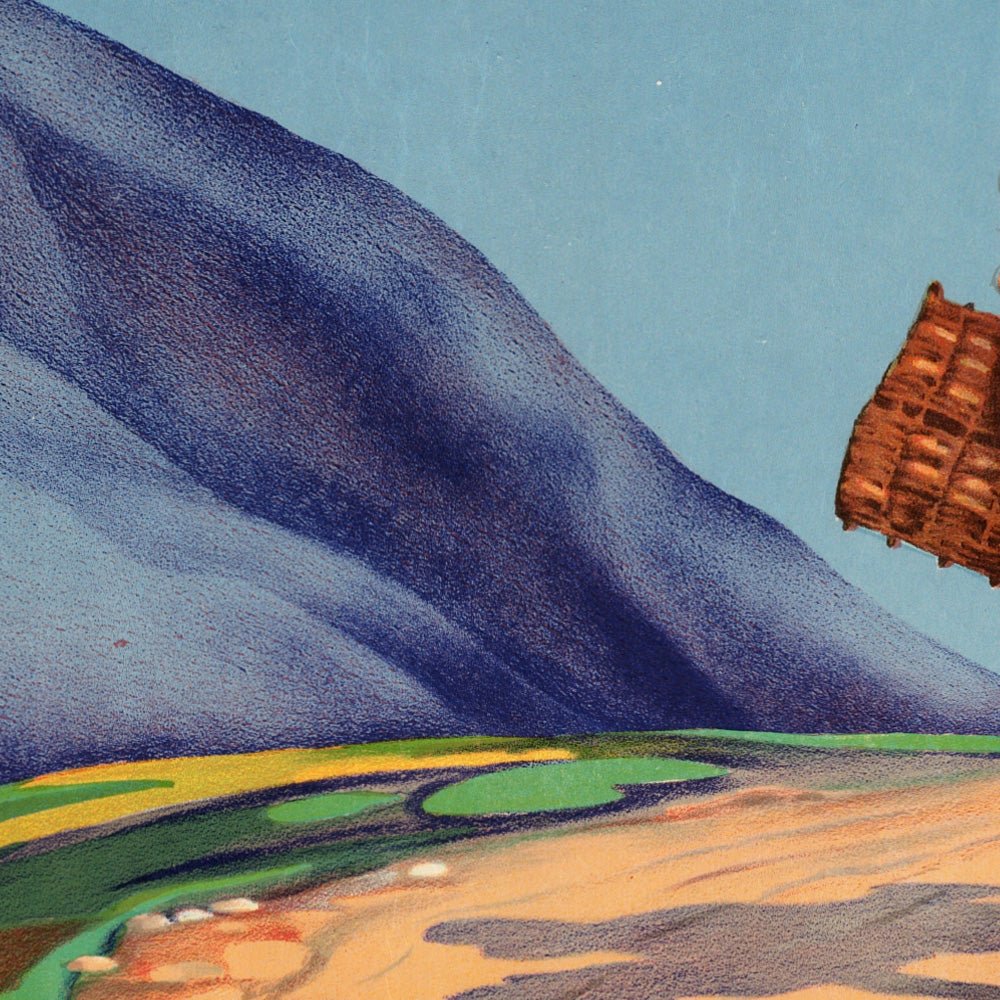 Design and color you can feel: The composition is pure travel-poster poetry. The road arcs like a ribbon of warm orange through bands of cool blue and fresh green, leading the eye to the distant pass. Broad, simplified color fields, crisp sans-serif lettering, and gentle tonal gradients in the sky reflect the streamlined styling of interwar poster art. The contrasts—blue heavens, green marsh grasses, and the coppery path—give the print an inviting, sunlit glow that brings depth and serenity to a room.