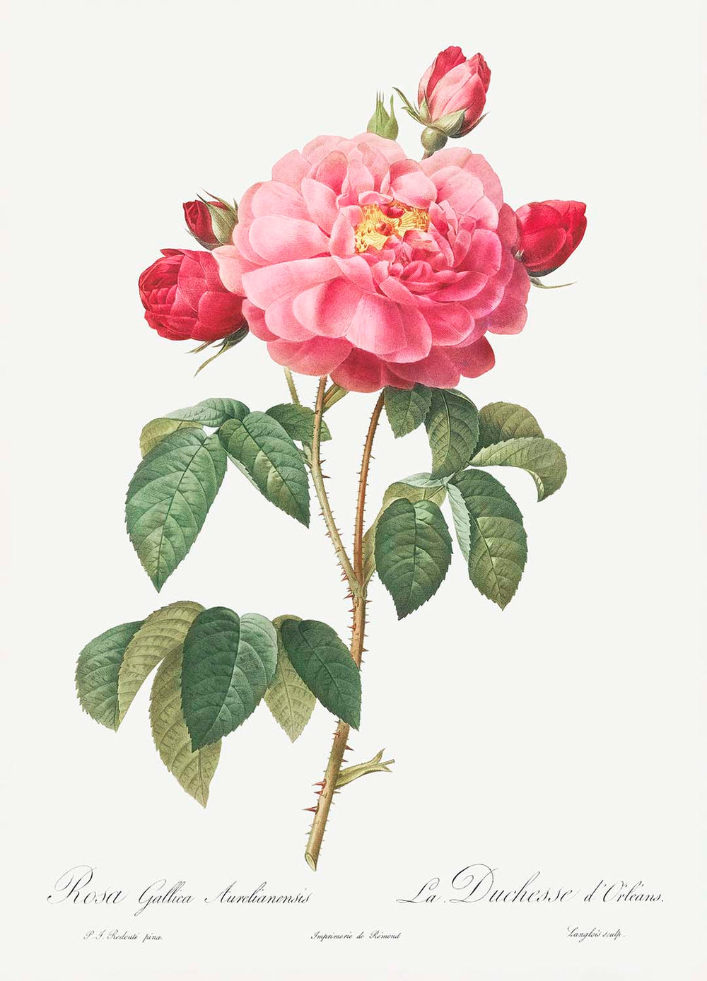 Die Gallische Rose, erstmals 1817 veröffentlicht, ist eines der schönsten botanischen Gemälde von Pierre-Joseph Redouté. Redouté verbrachte einen Großteil seines Lebens damit, die Blumen des Château de Malmaison auf Wunsch von Josephine Bonaparte - der Frau von General Napoleon - zu malen.