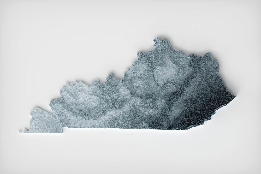 Erwecken Sie den Bluegrass State zum Leben mit dieser detaillierten Karte von Kentucky, Vereinigte Staaten. Von den sanften Hügeln der zentralen Bluegrass-Region bis zu den dramatischen Bergrücken und tiefen Tälern des Appalachen-Plateaus im Osten wird jede Kurve und Kontur des Landes wunderschön dargestellt. Beachten Sie, wie das Zusammenspiel von Licht und Schatten die rauen Gipfel und gewundenen Täler der Cumberland Mountains betont, während die sanften Wellen des Pennyroyal Plateaus und der Western Coal Fields elegant über die westliche Hälfte des Staates hinwegziehen.