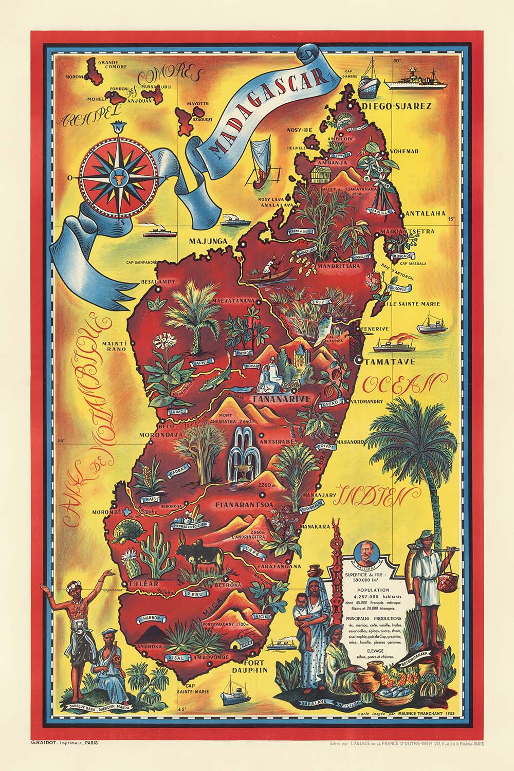 Madagascar… Superficie de l’ïle by Maurice Tranchant de Lunel (1952) is a radiant mid-century travel poster-map that transforms the island’s geography into a richly illustrated celebration of place. Designed in the decorative cartographic tradition of the 1940s–50s—when maps were as much about romance and storytelling as wayfinding—it pairs a stylized outline of Madagascar with lively vignettes of local culture and natural life. The title’s nod to the island’s “superficie” (area) hints at geographic substance, while the imagery revels in the era’s optimism for exploration and tourism.