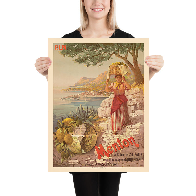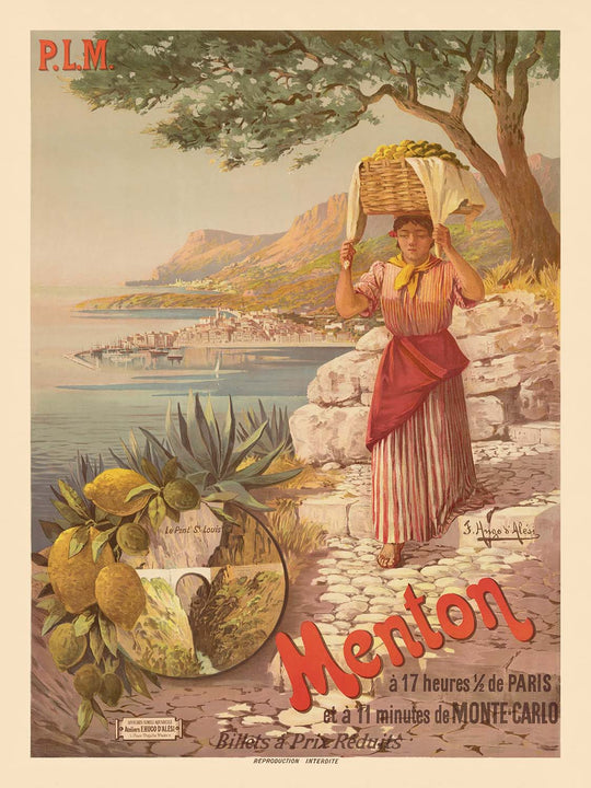 P.L.M. Paris–Lyon–Méditerranée: Menton à 17 h 1/2 de Paris et à 11 minutes de Monte‑Carlo by Frédéric Hugo d’Alesi (1898) captures the French Riviera at the height of the Belle Époque travel boom. Designed to entice modern rail passengers to the sun‑kissed edge of France, this luminous poster pairs an idyllic coastal vista with a proud local figure bearing a basket of lemons—an emblem of Menton’s famed microclimate and citrus heritage. Alesi’s poetic typography highlights how swiftly the PLM railway could deliver travelers to this Mediterranean haven, underscoring Menton’s closeness to Monte‑Carlo and its glamour.