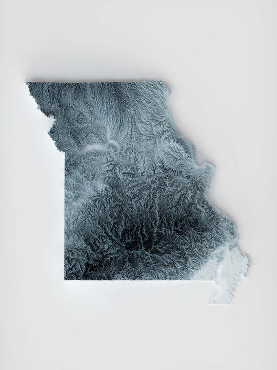 Feiern Sie den Geist von Missouri mit dieser wunderschön detaillierten 3D-gravierten Reliefkarte, die das vielfältige geografische Gefüge einfängt, das den Show-Me State wirklich einzigartig macht. Die Oberfläche der Karte erweckt die Geschichte von Missouris Landschaften zum Leben, indem subtile Variationen von Licht und Schatten den sanften Schwung der nördlichen Prärien, die sanften Hügel und Flusstäler sowie die dramatischen Konturen des Ozark-Plateaus hervorheben.