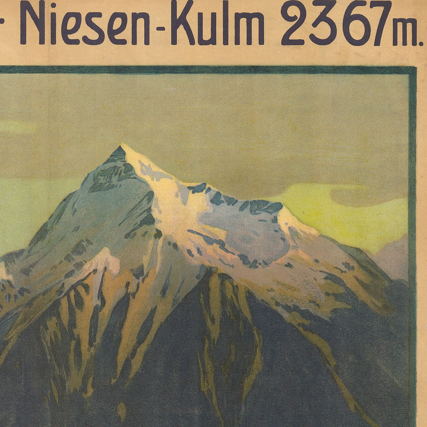 The poster’s subject is instantly recognizable: the Niesen, sometimes called the “Swiss Pyramid,” overlooking the shores of Lake Thun in the canton of Bern. In 1910, the Niesenbahn funicular made the mountain’s sweeping vistas accessible to day-trippers and grand-tour travelers alike. This image captures that moment when engineering and leisure converged—an invitation to ascend from lakeside serenity to the airy panorama of Niesen Kulm.