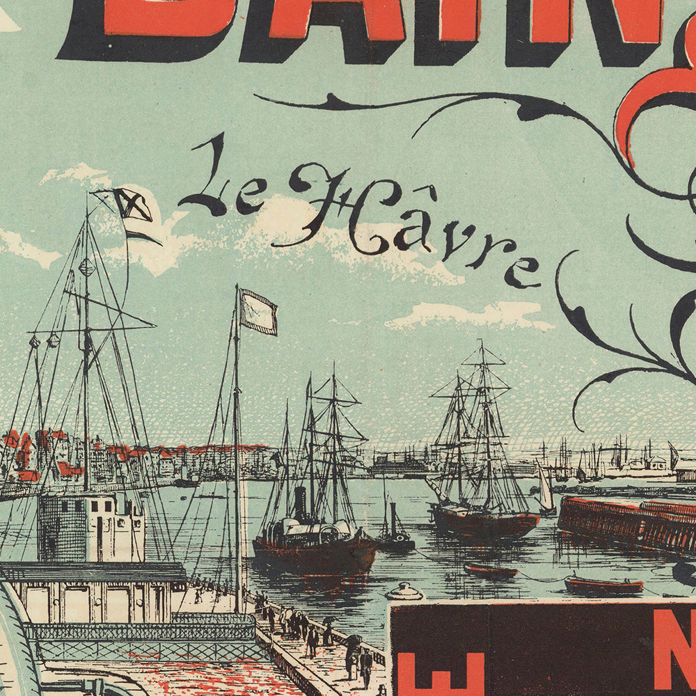 Visually, it is a feast of early poster design. The locomotive seems to surge out of the frame, its red buffer beam and white lamps punching forward against the blue field, while ornamental scrolls curl around the words “BAINS DE MER.” The mix of precise line‑engraved vignettes with bold block lettering bridges mid‑century railway broadsides and the more playful Art‑Nouveau posters that followed. The blue‑red‑brown triad is easy to live with, pairing beautifully with neutral interiors and adding a smart, travel‑minded accent to hallways, studies, or living rooms.
