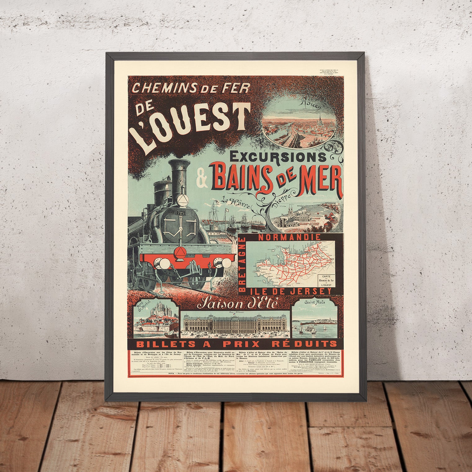 What makes this artwork particularly compelling is how clearly it captures the rise of leisure travel in Belle‑Époque France. “BILLETS A PRIX RÉDUITS” announces affordable fares; “SAISON D’ÉTÉ” signals the annual migration to the sea; and the red‑lined “CARTE des Chemins de fer de l’Ouest” shows a web of lines radiating from Paris to Rouen, Le Havre, Dieppe, and westward to the fortified harbors and wide beaches of Brittany, then by boat to Jersey. For anyone who has wandered Mont St‑Michel’s ramparts or watched sails tack across the bay at Saint Malo, the poster reads like an illustrated memory.