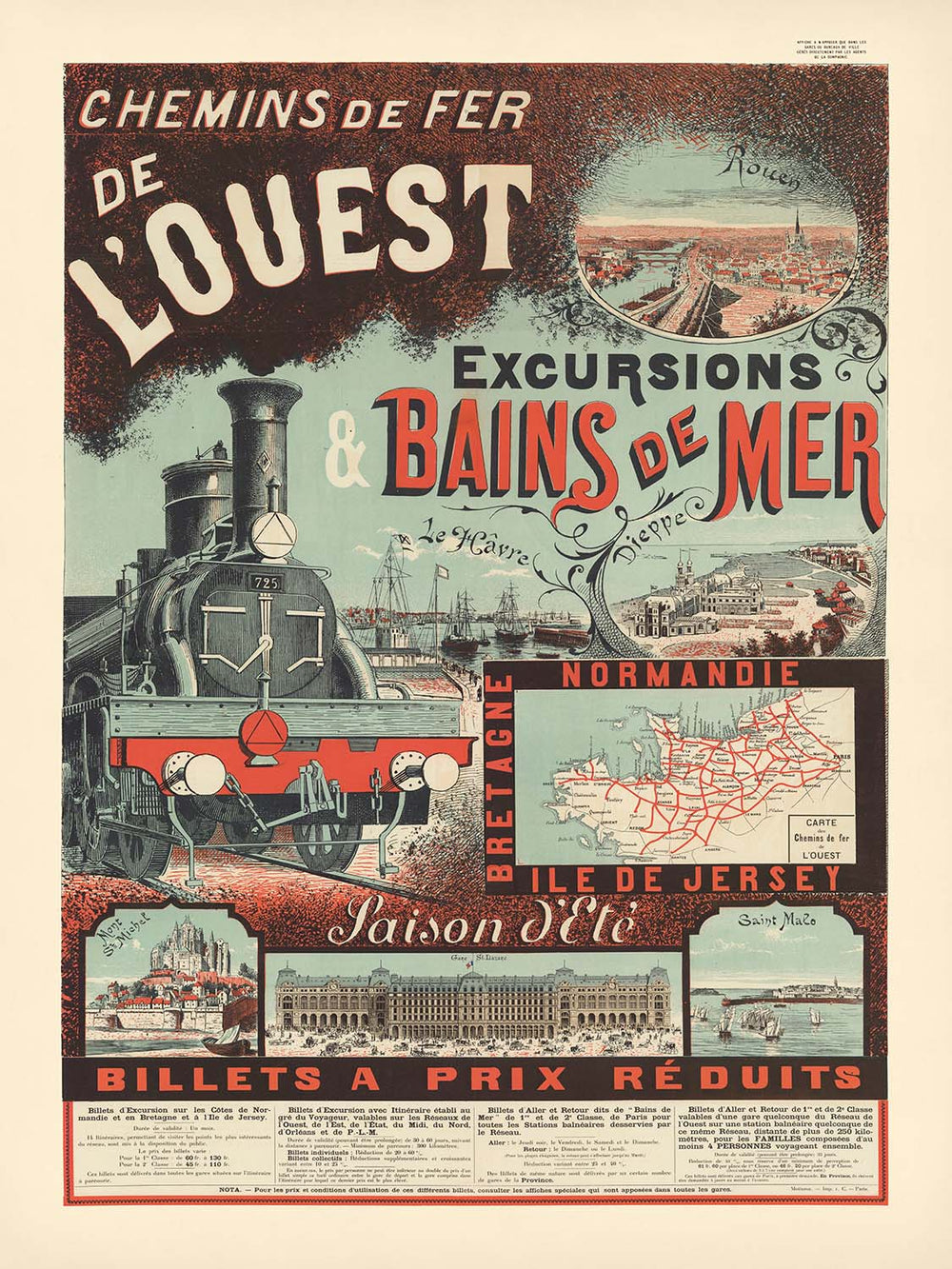 Chemins de Fer de l’Ouest. Excursions & Bains de Mer (1880) is a classic French railway poster from the golden age of seaside travel, created for the Western Railway network by an anonymous house artist. Centered on a proud steam locomotive numbered 725, the design invites Parisians to the coast for summer “baths of the sea.” Around the engine, crisp vignettes name the routes and resorts—Rouen at the top, and along the coast Le Havre and Dieppe—while a sweeping coastal panorama and a route map promise quick escapes to Normandie, Bretagne and the Île de Jersey. At the foot of the poster, delicately engraved views of Mont St‑Michel, the bustling Gare St‑Lazare, and Saint Malo complete the itinerary. The palette is unmistakably maritime: a cool sea‑blue ground, coral‑red lettering, and chocolate‑brown shading, with stippled textures that make the smoke and surf shimmer.