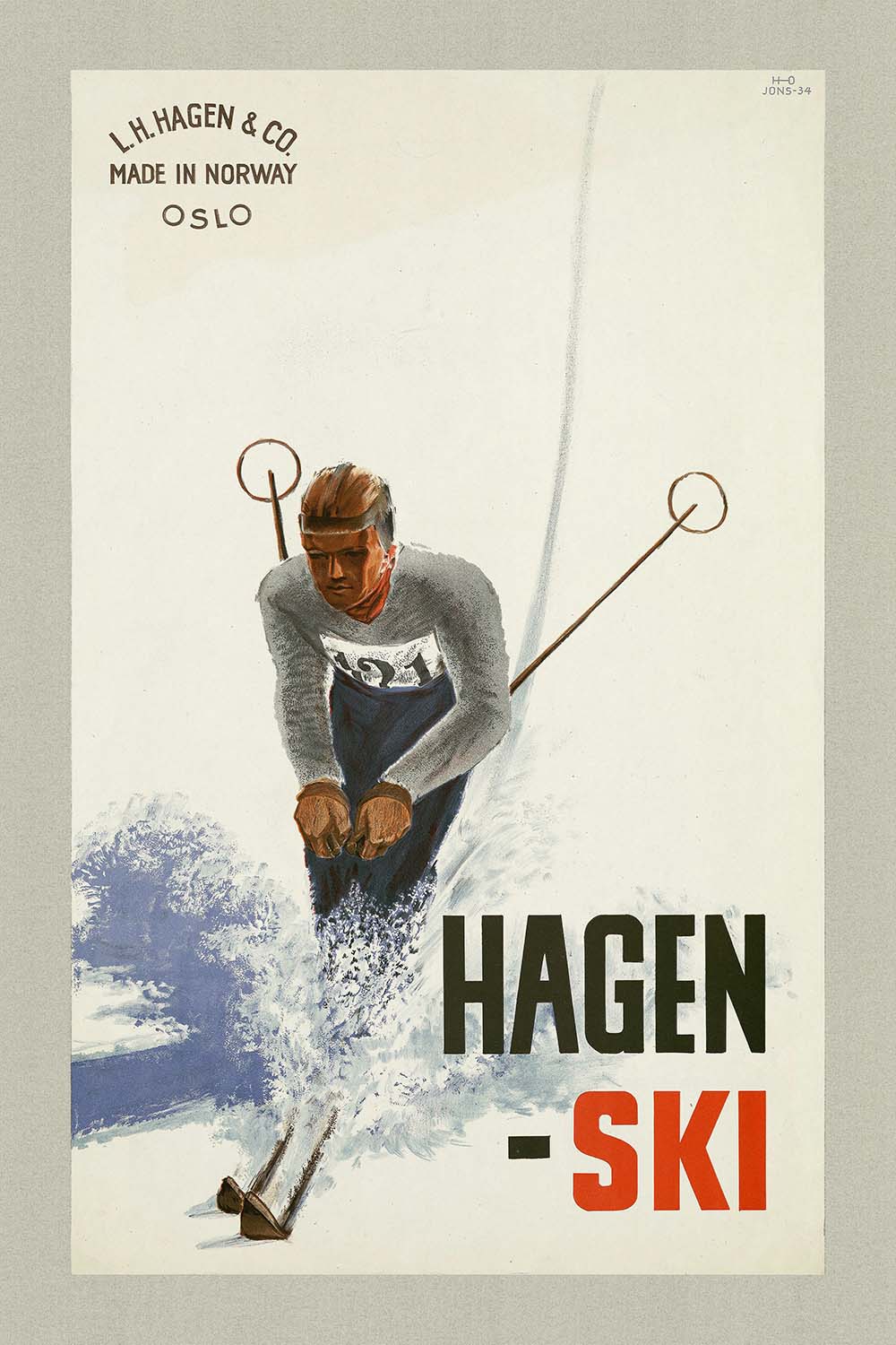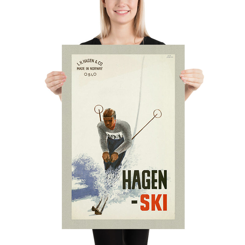 Hagen – ski by Einar Johnsen (1934) is a brisk, modernist celebration of winter sport from the golden age of Scandinavian poster design. Created in the interwar years, when skiing was transforming from a means of travel into a lifestyle and tourism draw, the image captures a skier cutting a dynamic arc across fresh snow. The crisp, sans‑serif headline and streamlined figure signal the confidence of early 20th‑century advertising, while the composition channels the speed, freedom, and national pride bound up with Norway’s snowy peaks and winter culture.