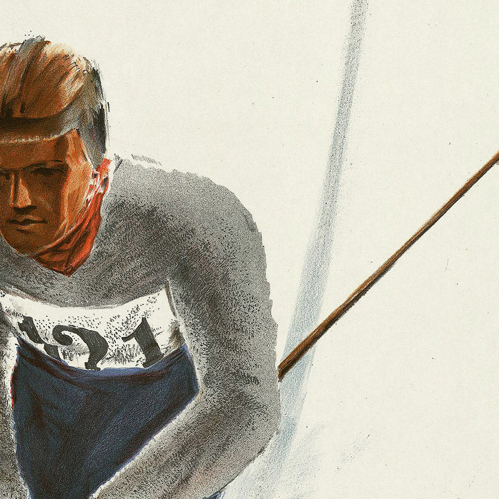 Color and form elevate this piece beyond simple promotion. A luminous, mostly white ground evokes open snowfields, against which rich blue brushwork sweeps forward to suggest speed and carving turns. Splashes and curving lines animate the skier’s path, while accents of red and black in the typography deliver graphic punch and impeccable legibility. The dynamic diagonal composition, restrained palette, and suave modernist lettering make this a striking focal point in contemporary interiors—perfect above a console, in a hallway gallery, or as chalet-inspired wall art that pairs beautifully with natural woods, charcoal textiles, and winter neutrals.