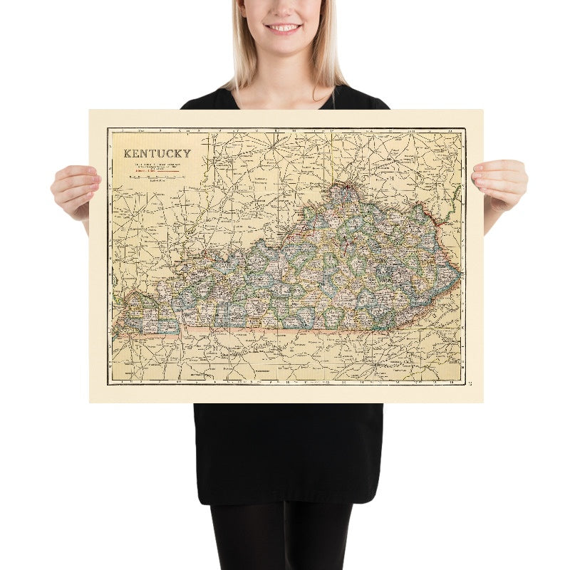 Titled “Kentucky,” this 1920 state map from the George F. Cram Company of Chicago captures a decisive moment when motor travel, electrification, and county governance converged to reshape the Bluegrass State. Using the Greenwich meridian for its longitudinal frame, it situates Kentucky within a global cartographic standard while remaining intensely local in detail. Hachures give texture to the Appalachian east and the gentler Bluegrass, casting light and shadow across ridges and river valleys. Administrative boundaries are crisply drawn, with each county annotated by its 1920 census population, transforming the sheet into a demographic ledger as much as a guide. Color is used with purpose: principal cities and the state capital stand out in green, highways blaze in red, and state roads course in blue—an elegant grammar for an era in motion.