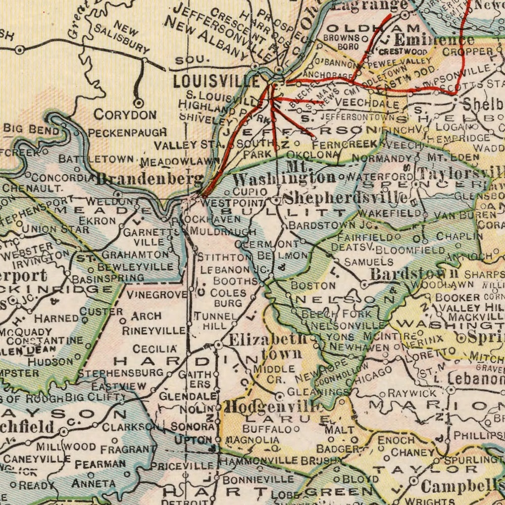 As a political map, it excels at human geography. Counties are sharply delineated, each stamped with its 1920 census total, enabling instant comparisons between the populous urban centers and the agrarian uplands. Jefferson County dominates with Louisville’s industrial might; Fayette’s Lexington leads the Bluegrass; Kenton and Boone reflect the gravitational pull of Cincinnati via Covington and Florence. Along the Ohio, Daviess County’s Owensboro and Henderson County’s river city mirror the commercial vitality of barge landings and warehouses. Madison County’s Richmond and Hardin County’s Elizabethtown emerge as pivotal inland nodes, proof of roads making new markets. Principal cities and the capital, Frankfort, pop in green—an at-a-glance key to power, trade, and influence, and a census-age ledger of Kentucky on the cusp of the modern era.