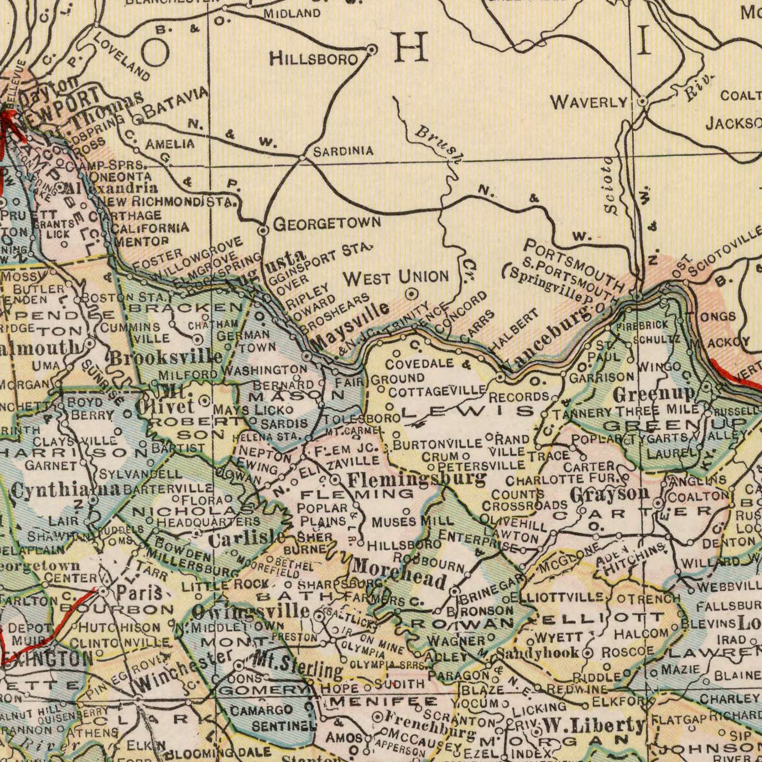 Electric lines, marked in red, trace the pulse of early twentieth-century modernity. In 1920 Kentucky, “electric lines” commonly denoted interurban trolley routes and power corridors, and their appearance here signals the state’s embrace of swift, frequent connections between city and countryside. Lines converging on Louisville and Lexington, and the dense lattice of Northern Kentucky around Covington, advertise commuter convenience and a budding metropolitan rhythm. Even where rural electrification lagged, these corridors foreshadowed transformation, tying courthouse towns to commercial hubs and smoothing the flow of mail, milk, and manpower. Overlaying the road network, the electric tracery reveals a layered mobility: steel rails, rubber tires, and copper wires orchestrated into a system that served both daily life and long-distance commerce.